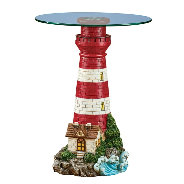 Nautical Lighthouse Glass Top Accent Table Hand Painted Bricks