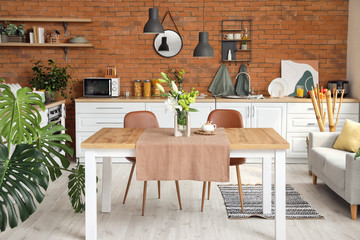 Modern Interior Design Of Dining Room With White Brick Wall And