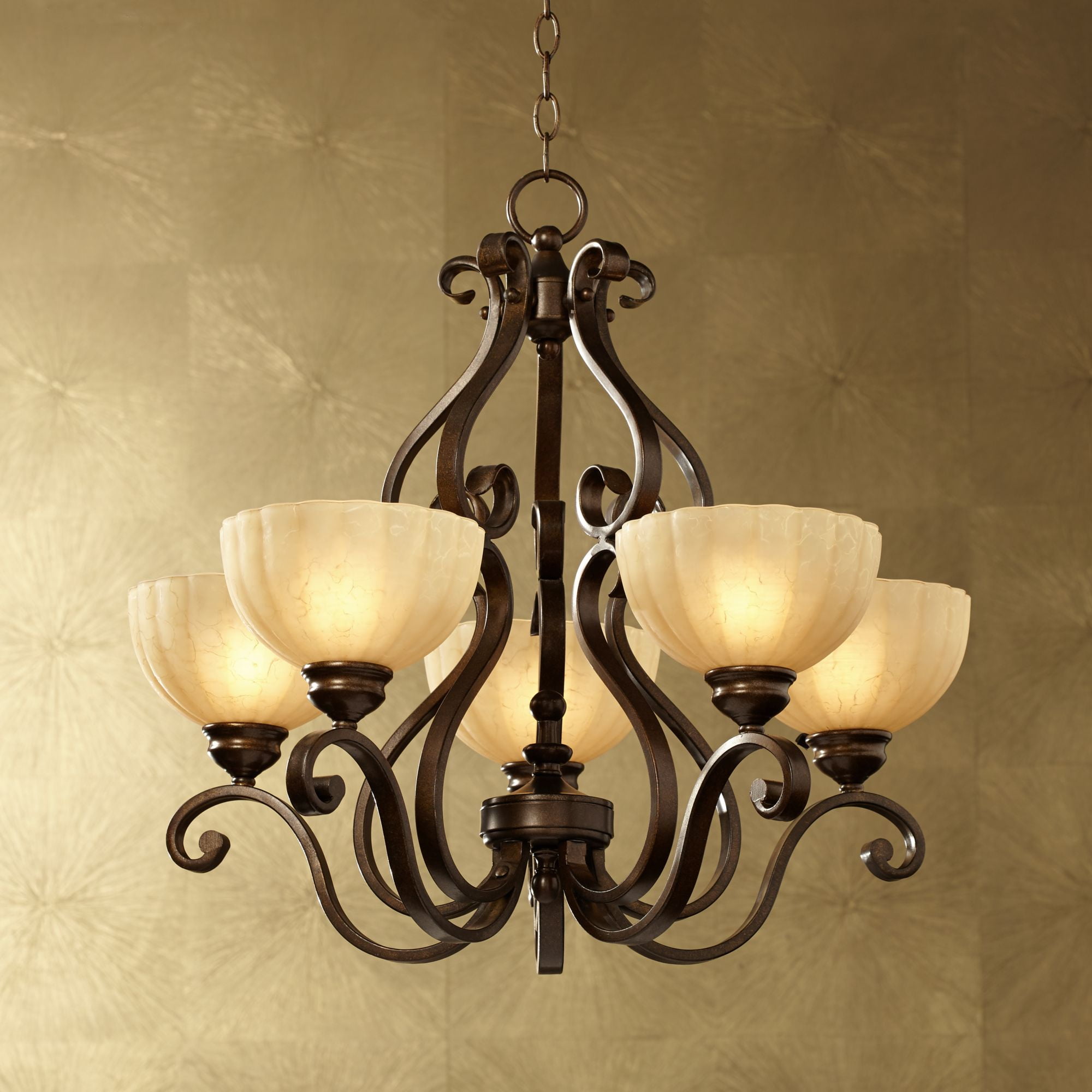 Franklin Iron Works Golden Bronze Chandelier 28 Wide Scroll Arms Amber Scalloped Glass 5 Light Fixture Dining Room