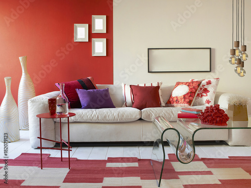 Red And White Living Room And Kitchen Stock Photo Download Image