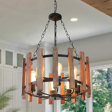 Baiwaiz Round Farmhouse Chandelier Light Metal And Wood Pendant
