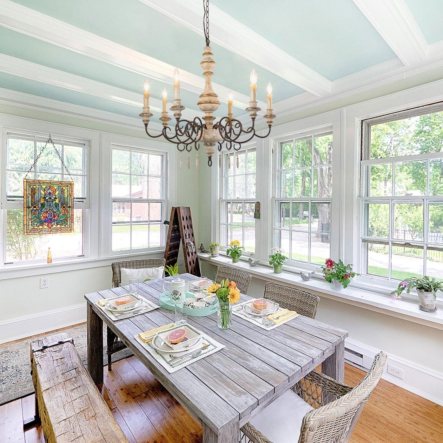 Laluz French Country Chandelier Farmhouse Handmade Wood 6 Lights