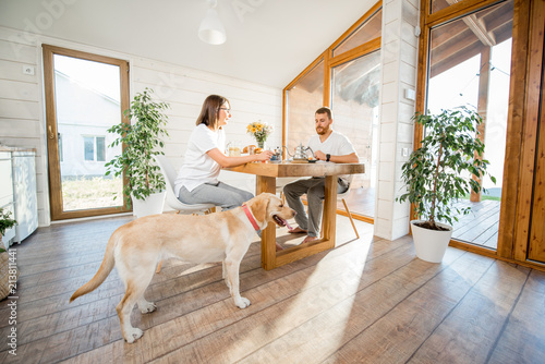 Young Couple Having A Breakfast Sitting With Dog In The Dining