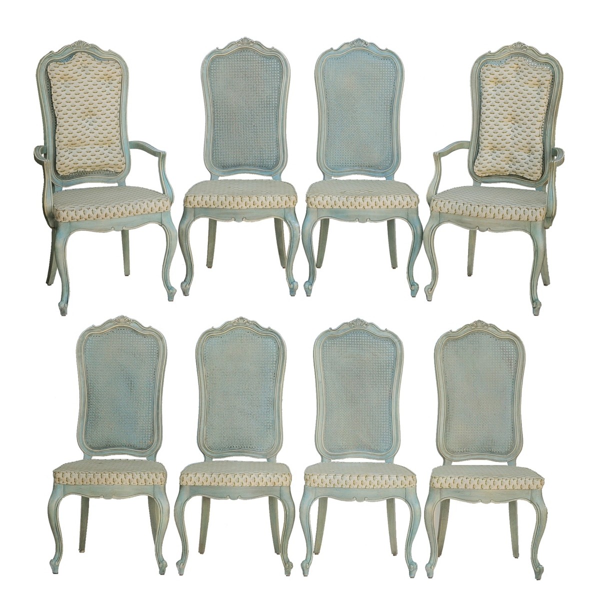 Set Of 8 Vtg Thomasville French Provincial Blue Green Painted Cane