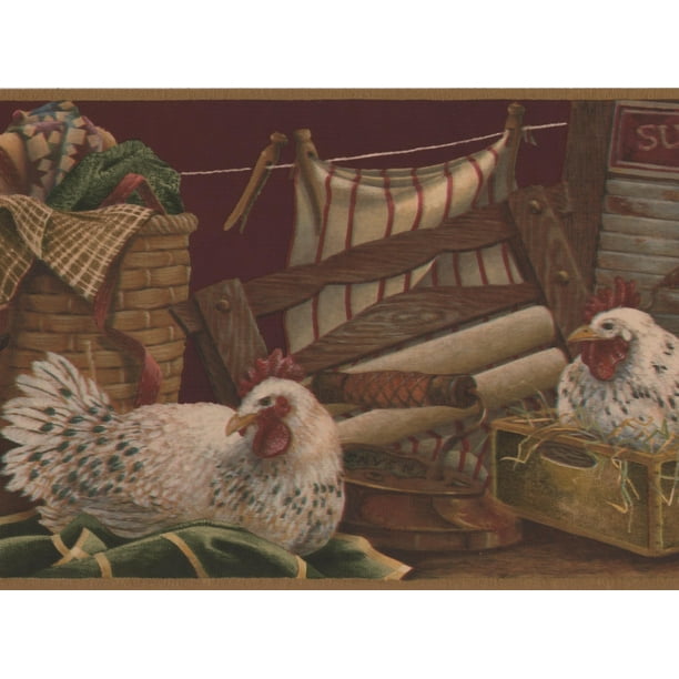 Wallpaper Border White Hens In Laundry Room Drying Line Garnet
